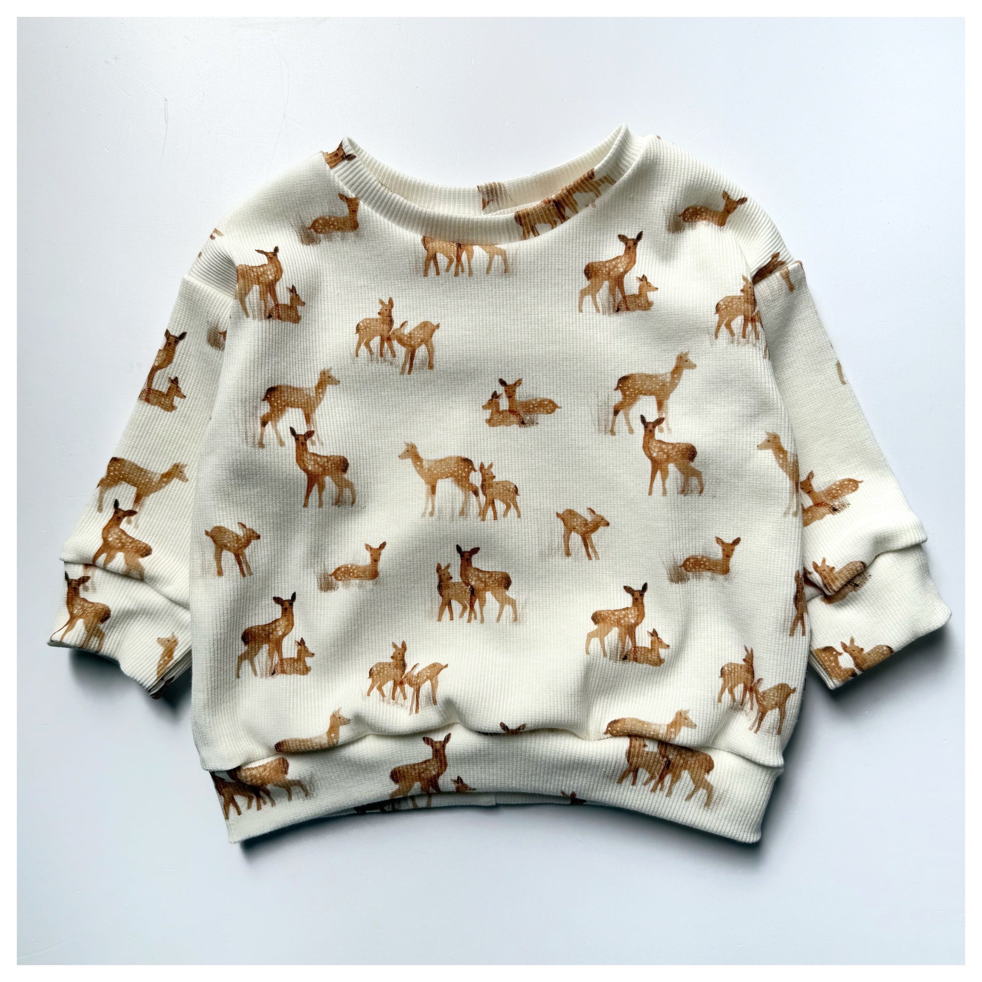 Der Sweater Rib Jersey "Rehkids" ist der ideale Begleiter für jede Jahreszeit. Ein leichter Oversized Pullover aus Ribjersey mit einem niedlichen Rehkids Design, besteht zu 95% aus Baumwolle und 5% Elasthan, wodurch er atmungsaktiv und bequem ist. Er lässt Ihrem Kind genügend Bewegungsfreiheit und der großzügige Halsausschnitt ermöglicht ein schnelles Anziehen. Der Sweater ist der perfekte Allrounder!